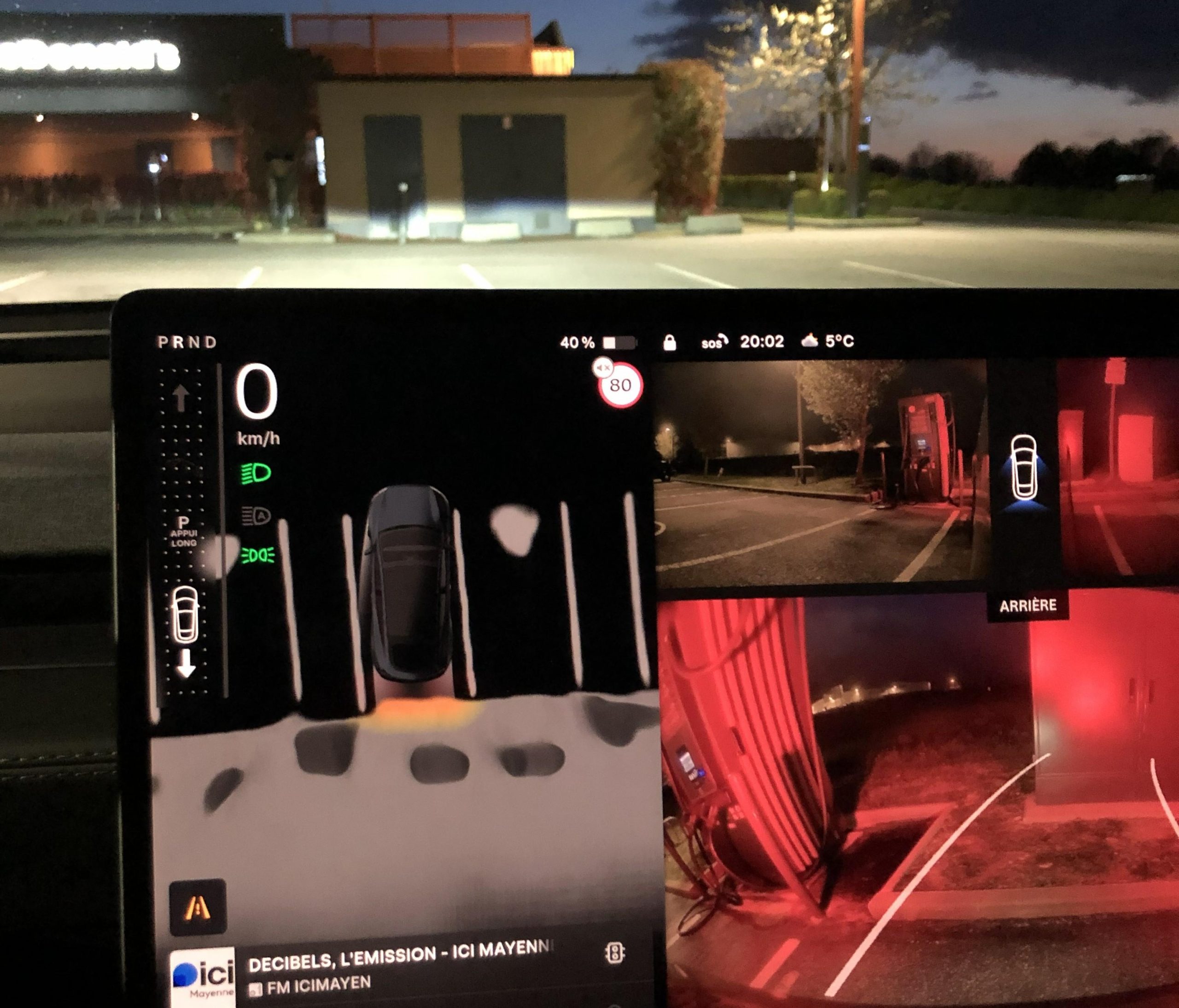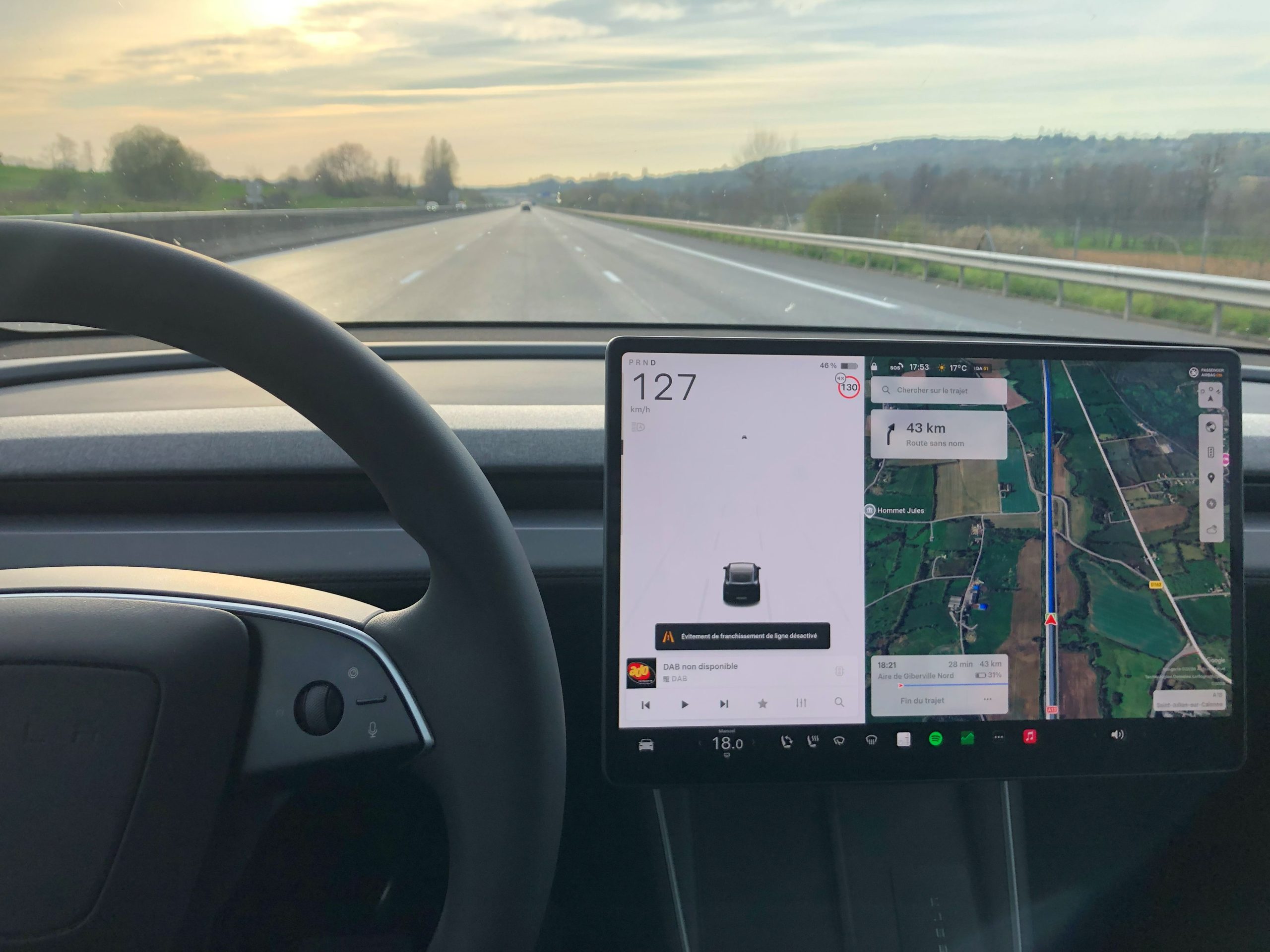 La seule façon trouvée pour activer le préconditionnement avant notre pause recharge, et lire le % batterie à destination, fut de programmer le trajet avec l’aire de Giberville comme destination finale. Heureusement, la commande vocale permet de le faire assez facilement.