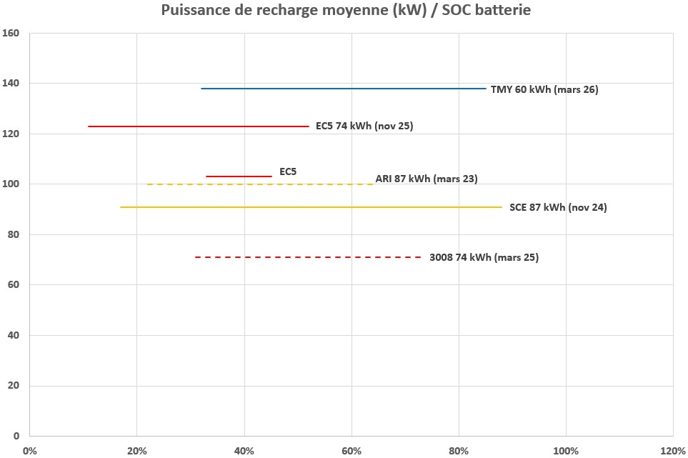 Beaucoup plus représentative que la puissance maxi, la puissance moyenne de recharge permet de comparer des batteries de capacités différentes : 10-80% en 30’…