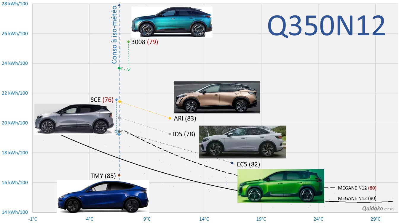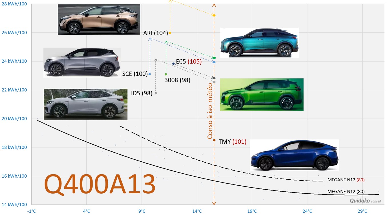 Pour comparer notre TMY à ses rivales, nous avons corrigé leurs consommations en les replaçant à iso-météo via les courbes de tendance issues de notre étalon Megane Q350N12 : delta vent contraire sur autoroute, versus nationale 156% = 100²/80² (vitesse moyenne).