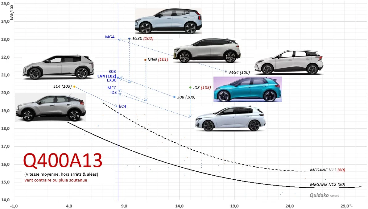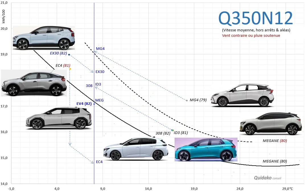Nos autres VE ayant été testés avec des météos différentes, les corrections s’effectuent via les courbes de tendance issues de notre étalon Megane Q350N12 : delta vent contraire sur autoroute versus nationale 156% = 100²/80² (vitesse moyenne).