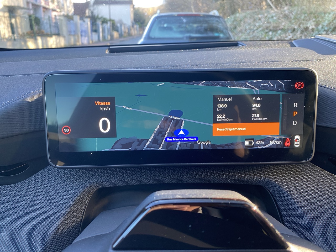 L’ergonomie est soignée, bien que certains choix soient discutables. Les raccourcis à gauche du volant permettent de désactiver les alertes de survitesse et d’accéder au mode « one-pedal », mais cela reste moins pratique que des palettes derrière le volant pour gérer la régénération.