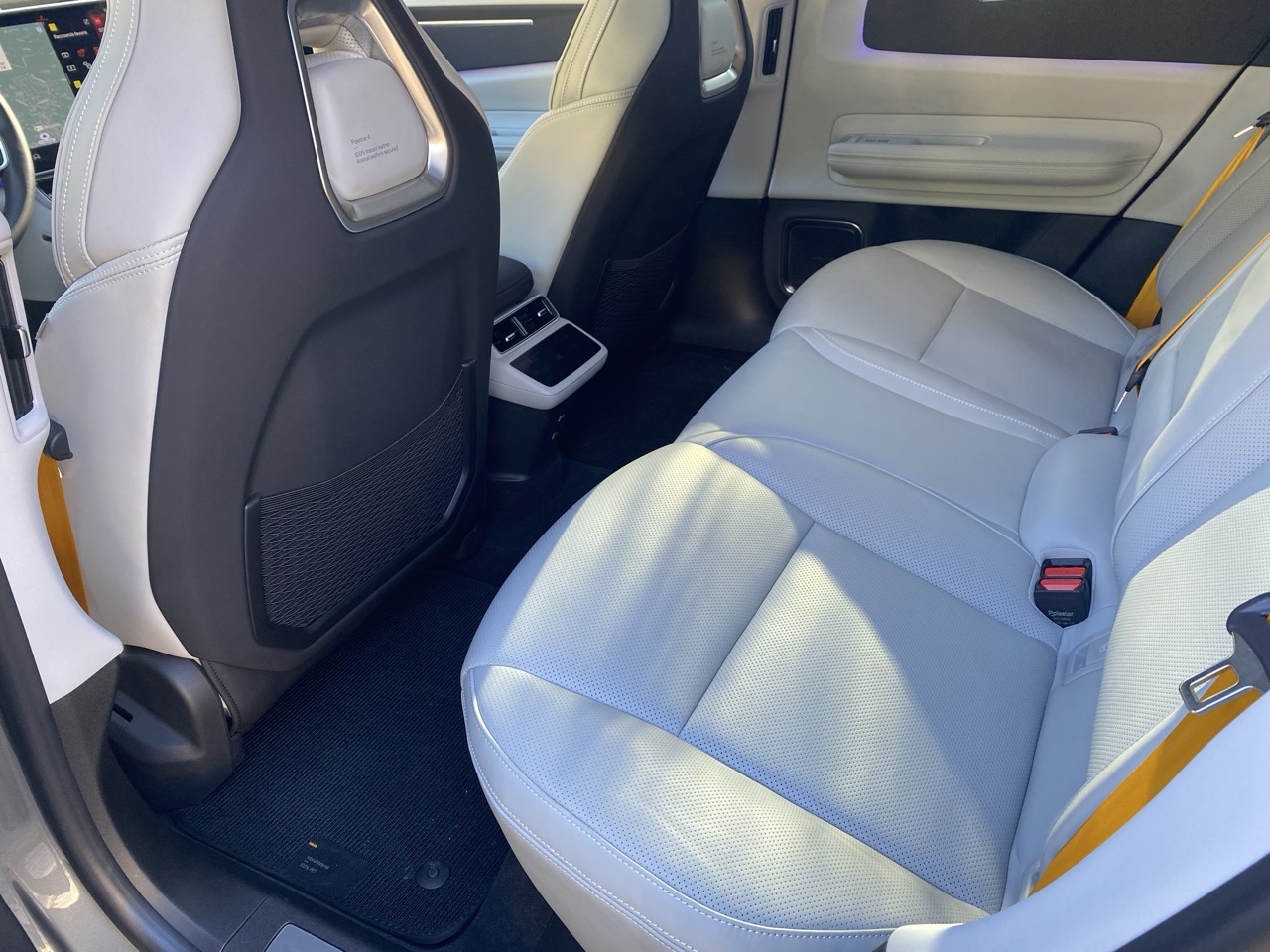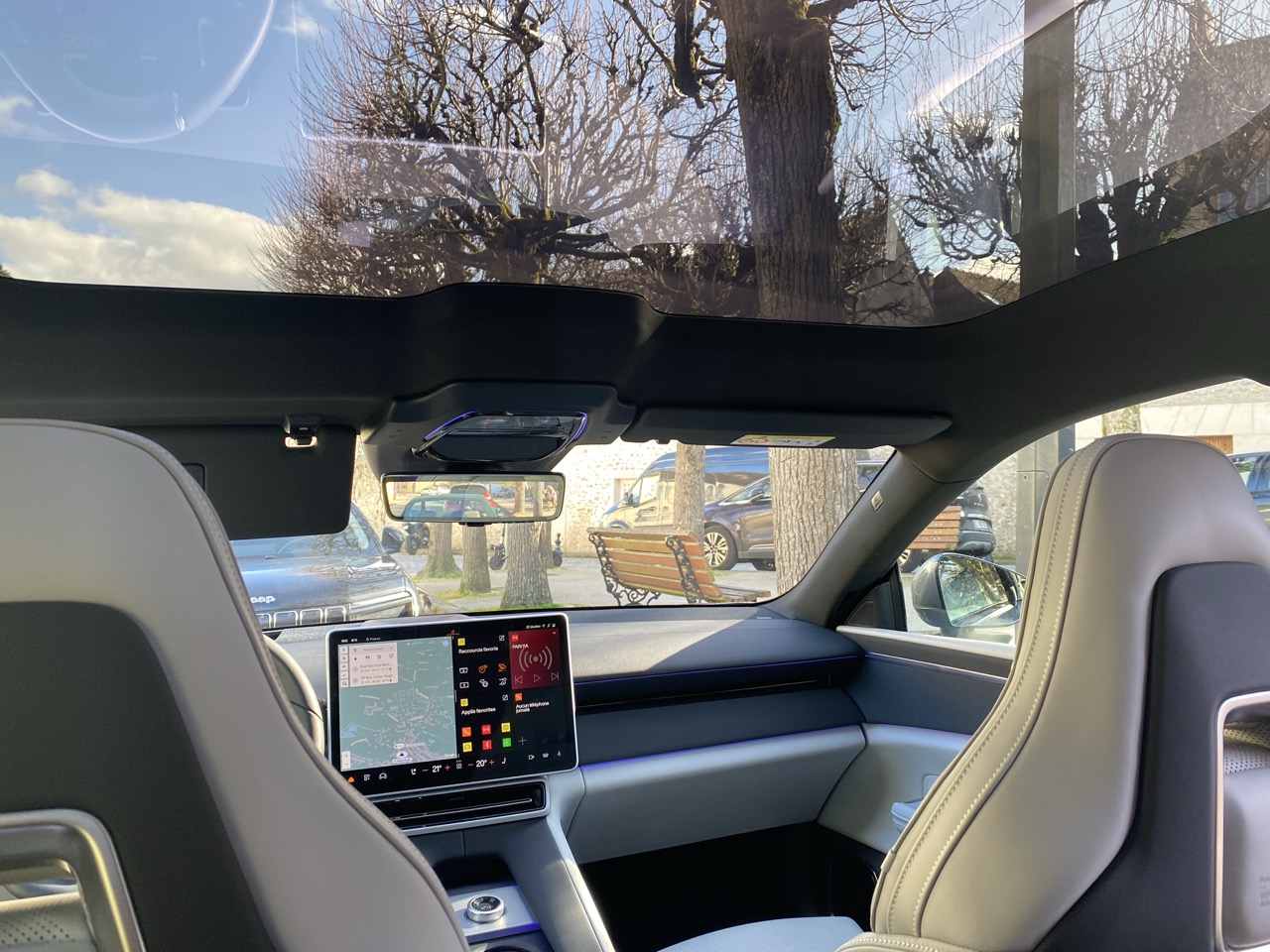 L’ambiance est particulièrement luxueuse avec un cuir nappa de haute qualité. Les sièges avant sont de véritables fauteuils : chauffants, ventilés et massants. À l’arrière, les passagers bénéficient d’un confort rare grâce à des sièges inclinables électriquement (avec le Pack Plus). Côté pratique, le profil conducteur est lié à la clé, ajustant automatiquement les réglages. Le volume de chargement est généreux avec un coffre de 526 litres et un petit frunk de 15 litres à l’avant pour les câbles.