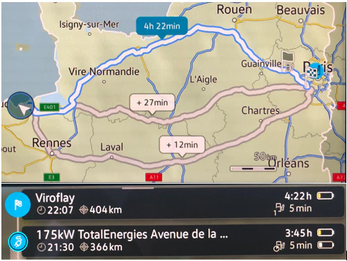 Pour réaliser notre trajet aller-retour entre Viroflay et la Bretagne Nord avec la Volkswagen ID5, nous utilisons plusieurs plannificateurs dédiés aux voyages en voiture électrique. Ci-dessous les itinérances proposées par Chargemap, ABRP, et WeConnectID de VW :